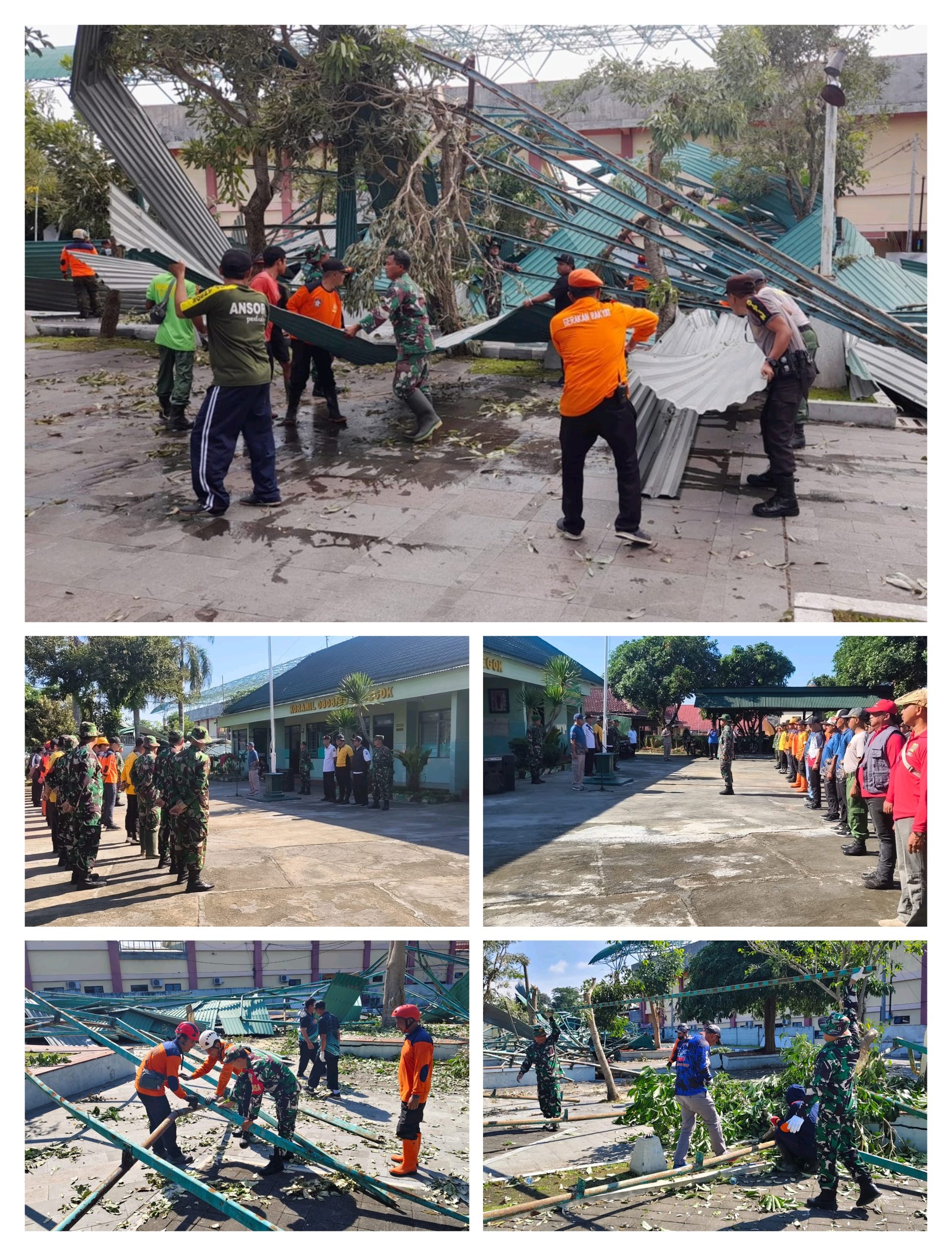 Kegiatan kerja bakti berlangsung dengan penuh semangat dan gotong royong. Para peserta bahu-membahu membersihkan puing-puing atap stadion yang runtuh akibat terjangan angin kencang. Selain membersihkan area, petugas juga melakukan pengecekan struktur bangunan untuk memastikan tidak ada bagian lain yang berpotensi membahayakan warga.