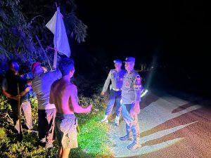 Personel Pamapta Polres Sekadau bergerak cepat mengamankan lokasi genangan air yang membahayakan pengendara di Jalan Sekadau – Sintang, Senin (15/12/2025). Laporan diterima sekitar pukul 22.00 WIB melalui Call Center 110 Polri setelah warga melaporkan adanya pengendara yang terjatuh.